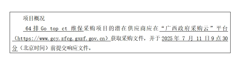 簡要規(guī)格描述或項目基本概況介紹、用途:64排Go top ct 維保1項。如需進一步了解詳細內(nèi)容,詳見競爭性磋商文件。