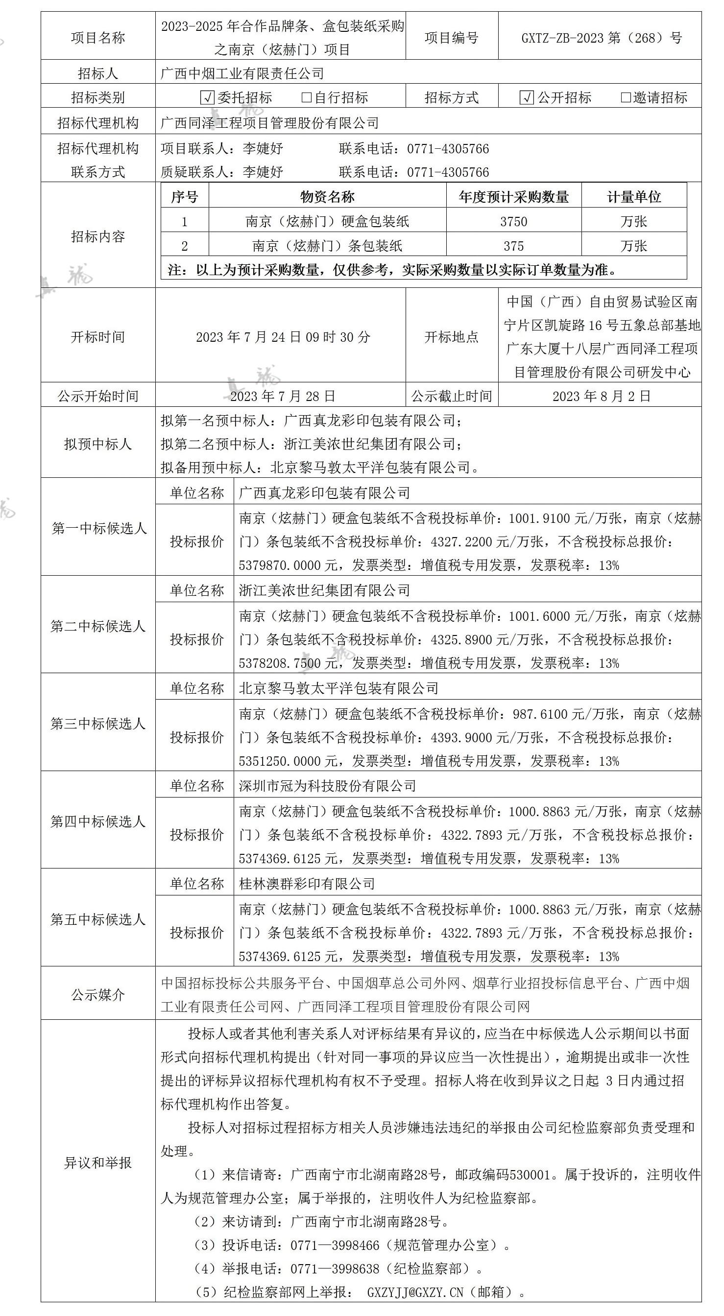 廣西中煙工業(yè)有限責(zé)任公司2023-2025年合作品牌條、盒包裝紙采購(gòu)之南京(炫赫門(mén))項(xiàng)目(項(xiàng)目編號(hào):GXTZ-ZB-2023第(268)號(hào))中標(biāo)候選人公示