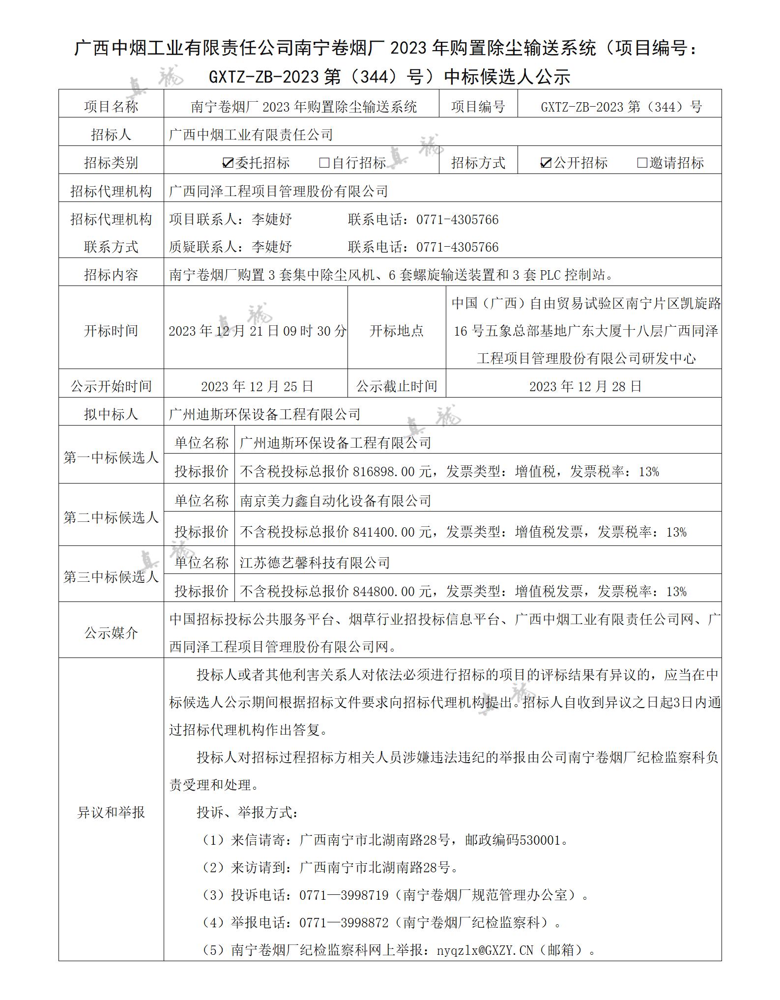廣西中煙工業(yè)有限責(zé)任公司南寧卷煙廠2023年購置除塵輸送系統(tǒng)(項目編號:GXTZ-ZB-2023第(344)號)中標(biāo)候選人公示