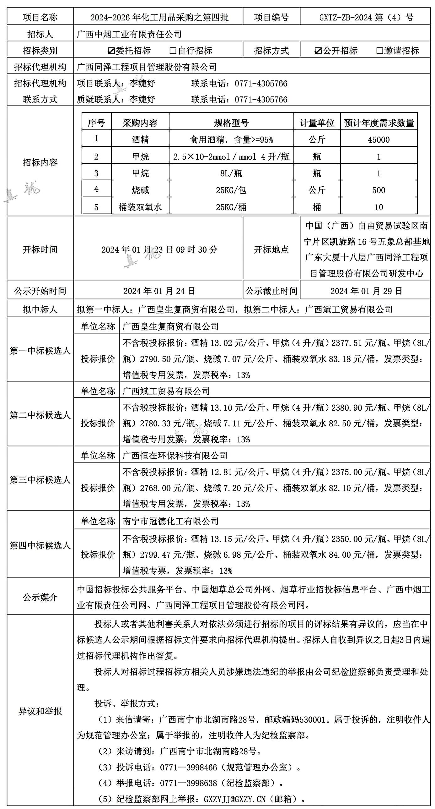 廣西中煙工業(yè)有限責(zé)任公司2024-2026年化工用品采購之第四批(項(xiàng)目編號(hào):GXTZ-ZB-2024第(4)號(hào))中標(biāo)候選人公示