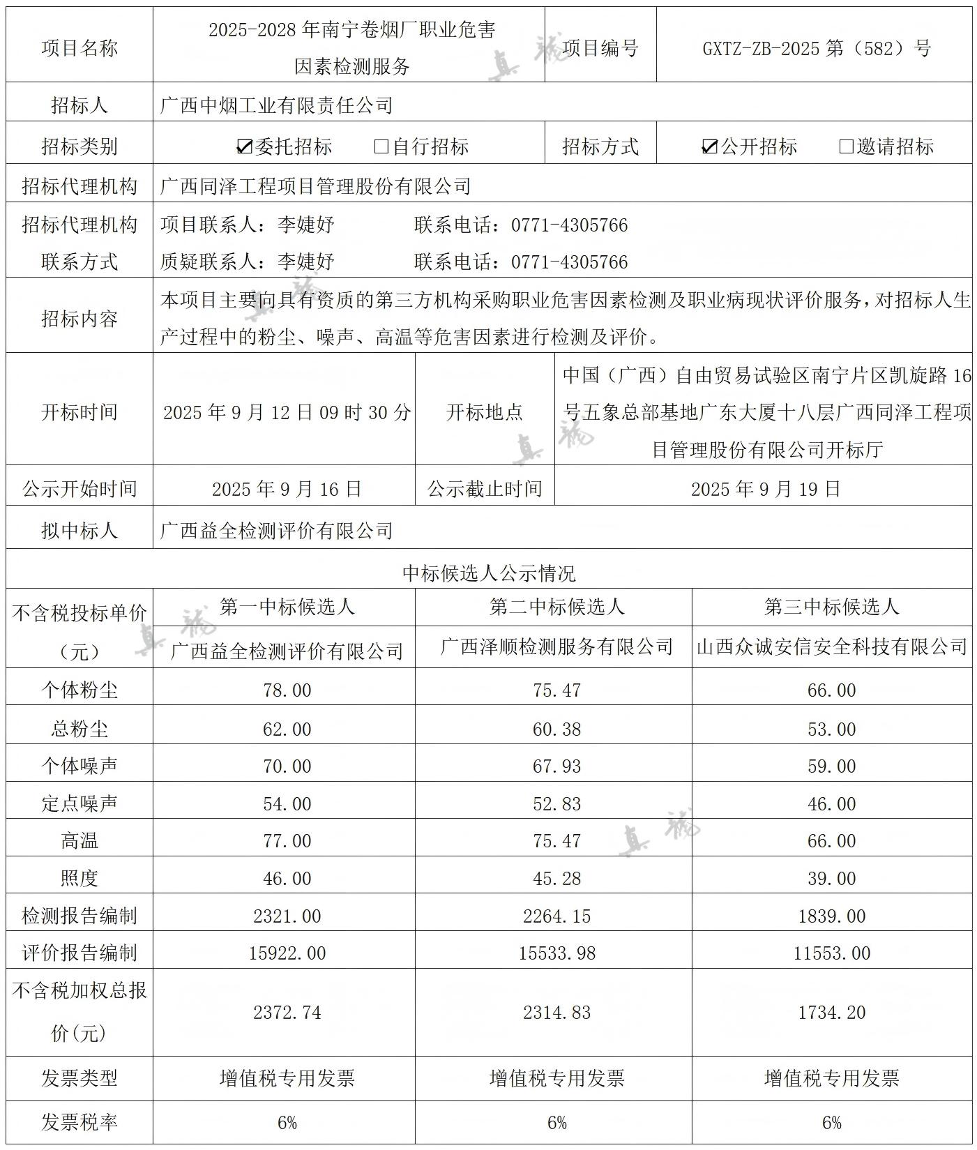 廣西中煙工業(yè)有限責任公司2025-2028年南寧卷煙廠職業(yè)危害因素檢測服務(wù)(項目編號:GXTZ-ZB-2025第(582)號)中標候選人公示